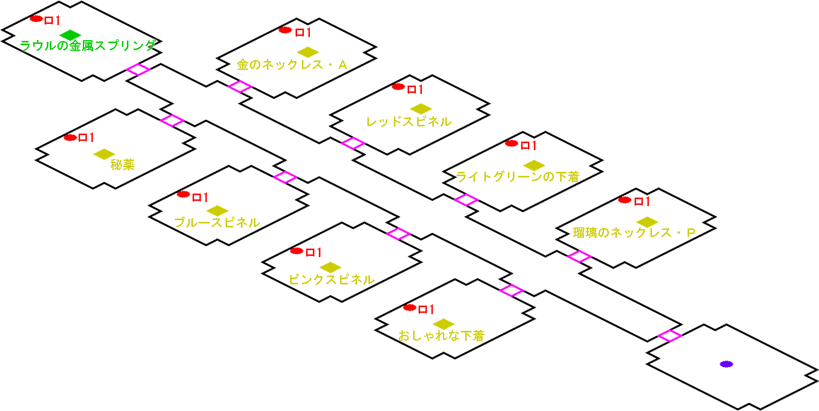 発生条件 ブリーフィング6の後 アイテム ラウルの金属スプリング, ピンクスピネル x1, ブルースピネル x1, レッドスピネル x1, おしゃれな下着 x1, ライトグリーンの下着 x1, 金のネックレス・A x1, 瑠璃のネックレス・P x1, 秘薬 x1 敵 ロボット1 x9