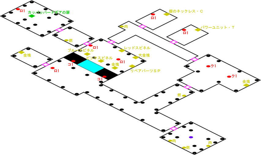 発生条件 エアナとメイル仲間にの後 アイテム カッパッパードギアの扉, 大金塊 x1, ピンクスピネル x1, ブルースピネル x1, レッドスピネル x1, 金塊 x3, 銀のネックレス・C x1, パワーユニット・T x1, 獣肉 x2, リペアパーツSP x1, 燃料パック x2 敵 ロボット1 x6, クマ1 x2, コウモリ1 x2