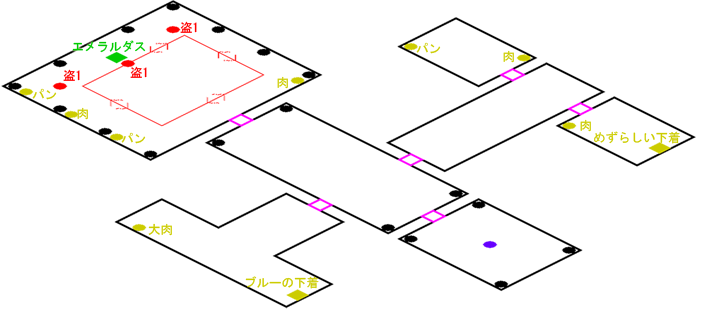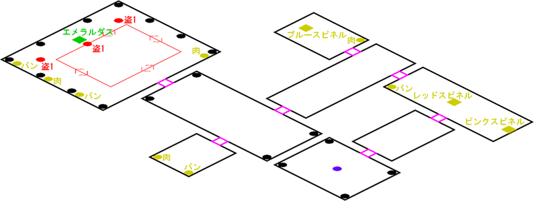 発生条件 レンザンを整備するアマネカの後 アイテム エメラルダス, ピンクスピネル x1, ブルースピネル x1, レッドスピネル x1, 獣肉 x4, ふかふかパン x4 敵 闇盗掘団 x3