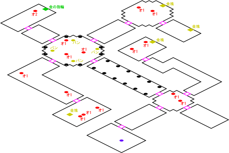 発生条件 心霊写真を見た後 アイテム 金の指輪, 金塊 x4, ふかふかパン x4 敵 オオカミ2 x1, オオカミ1 x14
