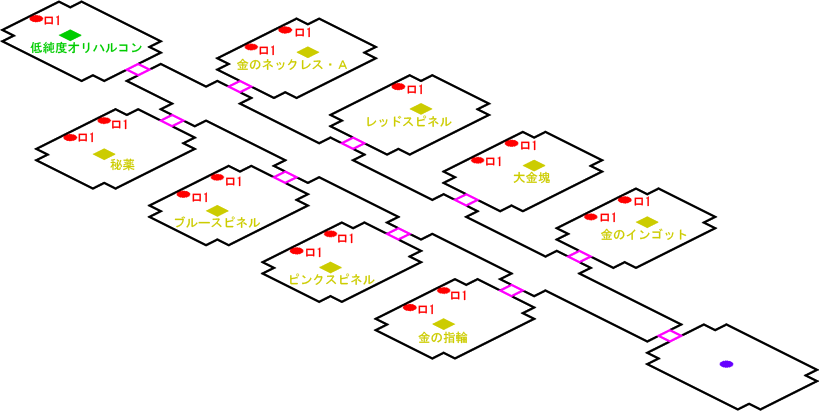 発生条件 ズイウン修理開始の後 アイテム 低純度オリハルコン, 大金塊 x1, 金の指輪 x1, 金のインゴット x1, ピンクスピネル x1, ブルースピネル x1, レッドスピネル x1, 金のネックレス・A x1, 秘薬 x1 敵 ロボット1 x16
