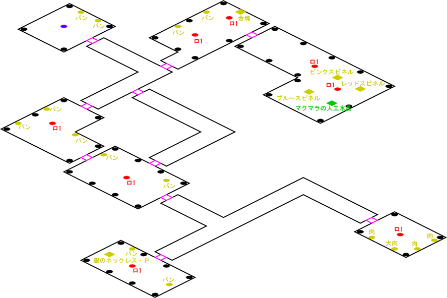 発生条件 海底Eプラントの情報入手後、ミズモが必要 アイテム ピンクスピネル, 獣肉 x2, ふかふかパン x7 敵 オオカミ1 x1, コウモリ1 x15