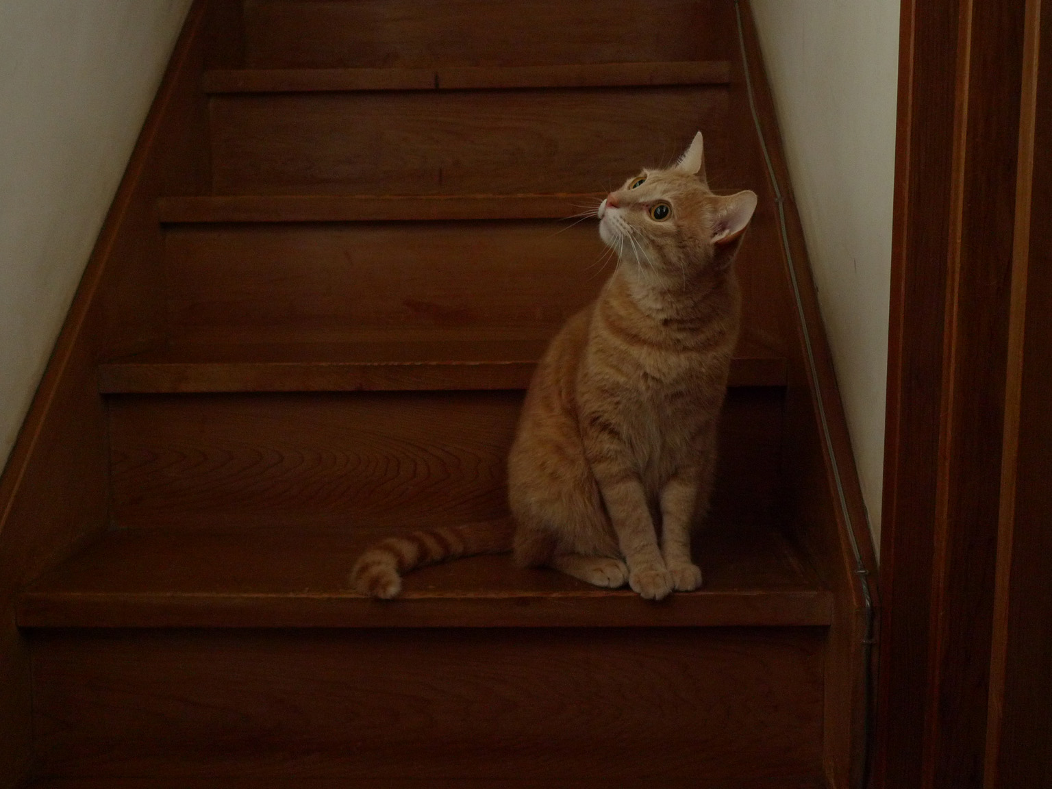 横位置で天井バウンス。階段なので天井が遠く、木造なのでこんな色になっています。